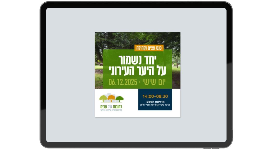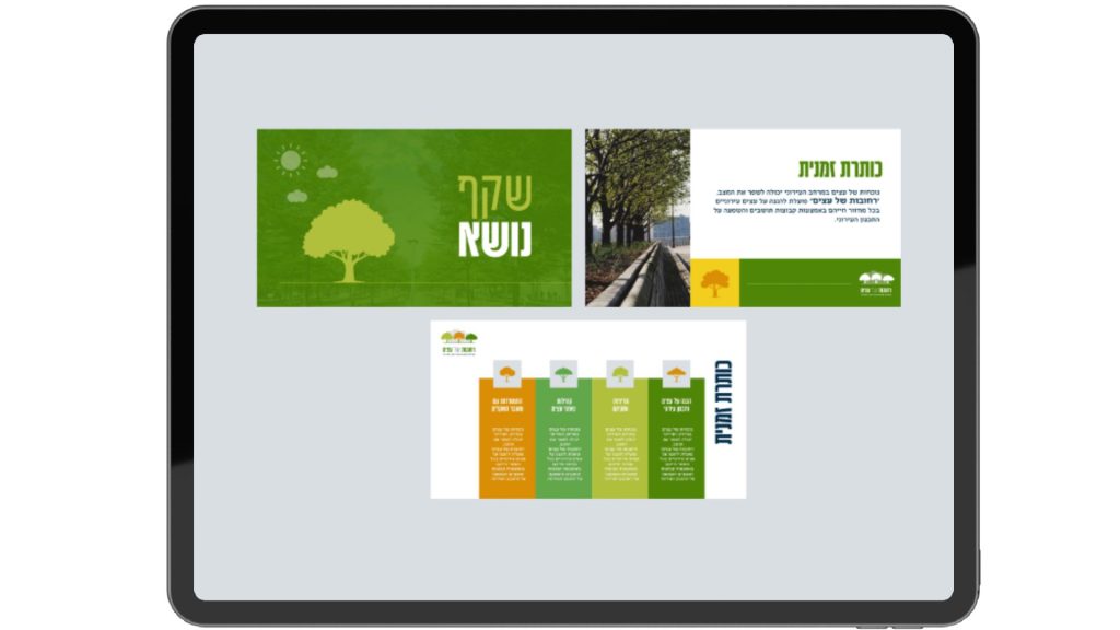 שמרנו על הנכס המותגי "רחובות של עצים", אך הענקנו לו פרשנות חדשה ומרחיבה דרך הסלוגן: "קהילות שומרות על היער העירוני". המעבר הזה הבהיר שהסיפור הוא לא על רחוב ספציפי, אלא על המרחב האורבני כולו והאנשים שבתוכו.